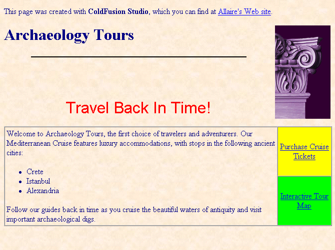 This tutorial acquaints you with the basics of using Studio for HTML authoring. Completing the tutorial produces a Web page that looks like the one below. It combines text, color, layout, formatting, and links in an attractive, functional design. The techniques you learn here apply to the major elements of building Web content.