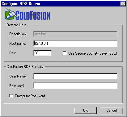 - Password -- Required if the server is password-protected. Open the ColdFusion Administrator Server > Basic Security page to edit or disable the Studio password.